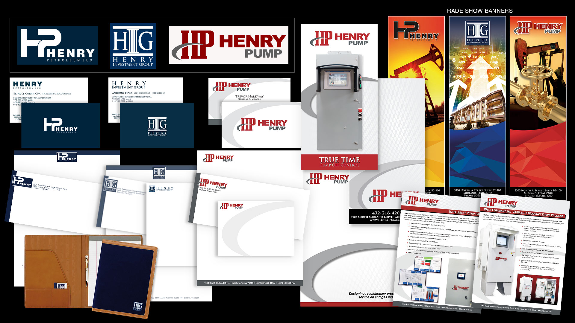 Henry Petroleum and HIG Logo Designs, Business Cards, Stationery, Presentation Folders, Sales Brochures and Flyers, Hard Hat Stickers, Trade Show Banners, Equipment Photography
