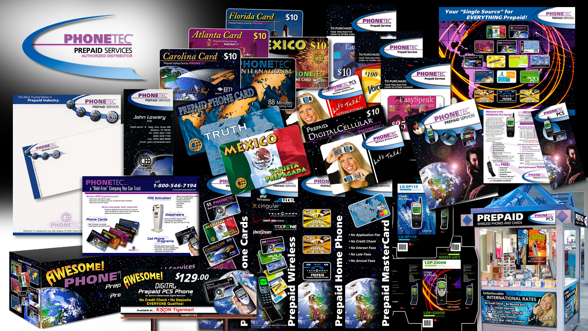 Logo Design, Business Cards, Stationery, Trifolds, Numerous Prepaid Card Designs, Scores of POS Posters, Kiosk Panels, Trade Show Graphics, Table Skirts, Retail Box Designs, Clamshell Packaging, Custom Website